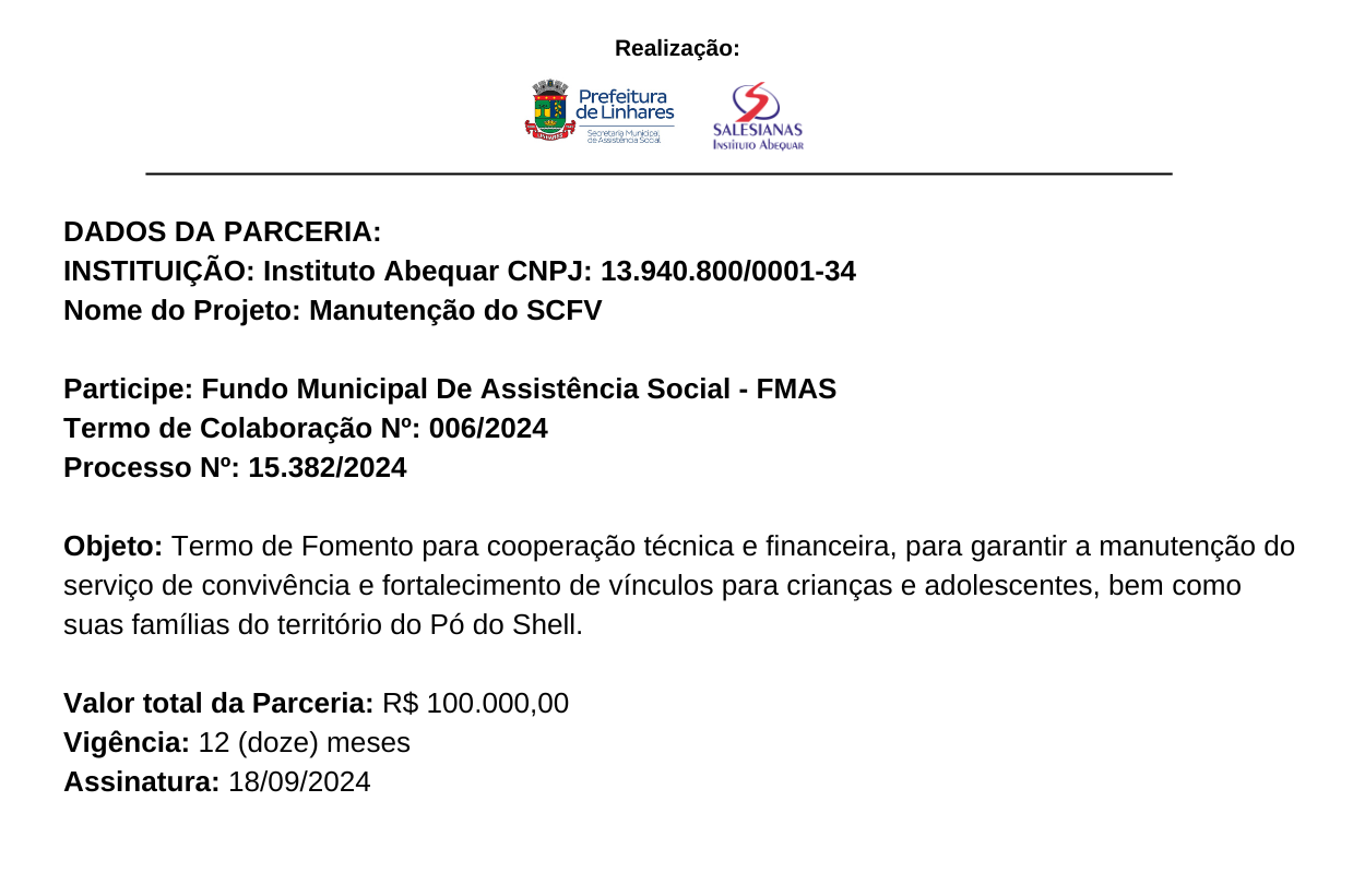 Termo de Fomento para cooperação técnica e financeira, para garantir a manutenção do serviço de convivência e fortalecimento de vínculos para crianças e adolescentes, bem como suas famílias do território do Pó do Shell.