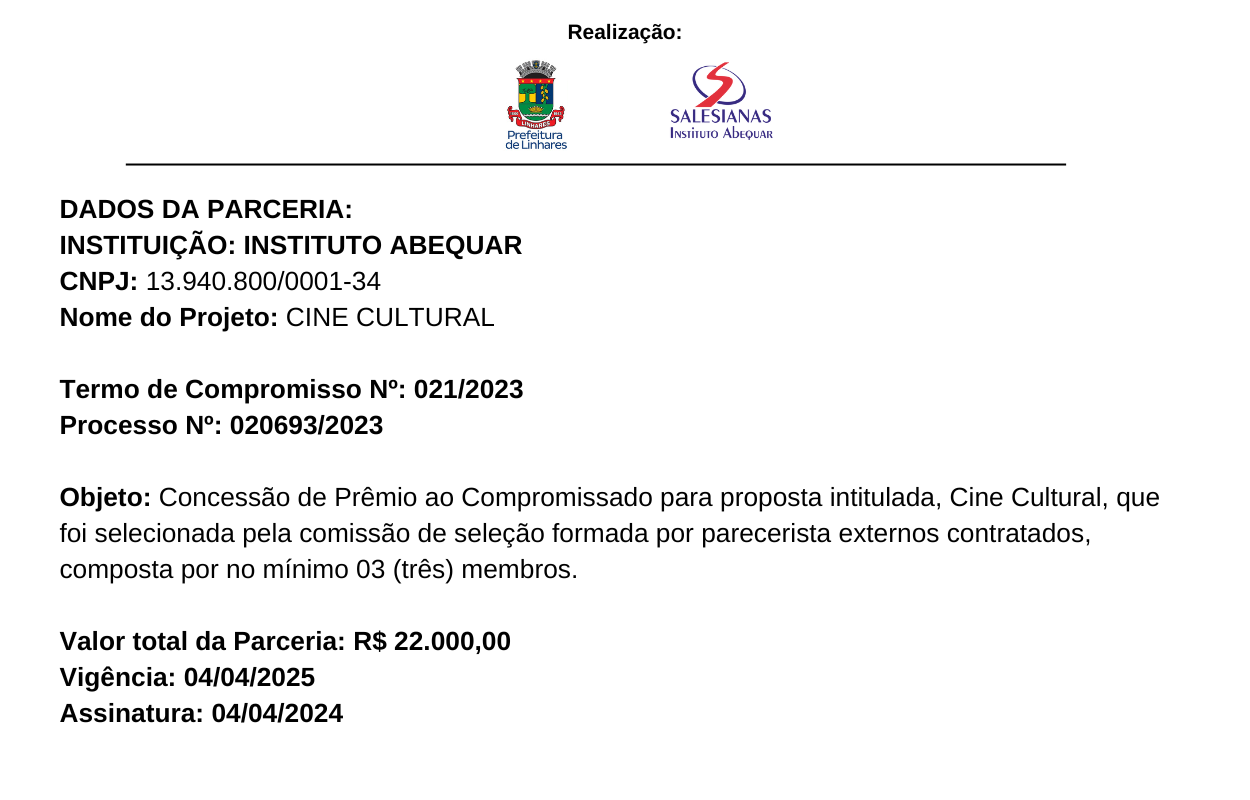 Concessão de Prêmio ao Compromissado para proposta intitulada, Cine Cultural, que foi selecionada pela comissão de seleção formada por parecerista externos contratados, composta por no mínimo 03 (três) membros.